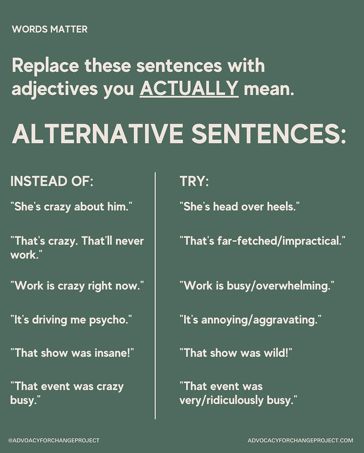 - Paying attention to language. It is astonishing how often people use the word crazy/insane in everyday conversation. It’s often used to describe something extraordinary (“That goal was insane!”), as an insult (“That guy is crazy!”), or as a joke (“You’re driving me crazy.”). This is an affront to me personally, and to many others I know with mental illness. It either downplays our experience and trauma as something trivial, or lumps us into the violent/incompetent category. I remember learning that the word ‘retarded’ was offensive back in the 80’s, and it has practically disappeared since then. I would love to see something similar happen with crazy/insane.**