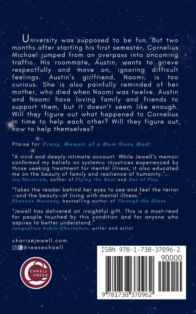 University was supposed to be fun. But two months after starting his first semester, Cornelius Michael jumped from an overpass into oncoming traffic. His roommate, Austin, wants to grieve respectfully and move on, ignoring difficult feelings. Austin’s girlfriend, Naomi, is too curious. She is also painfully reminded of her mother, who died when Naomi was twelve. Austin and Naomi have loving family and friends to support them, but it doesn’t seem like enough. Will they figure out what happened to Cornelius in time to help each other? Will they figure out how to help themselves?