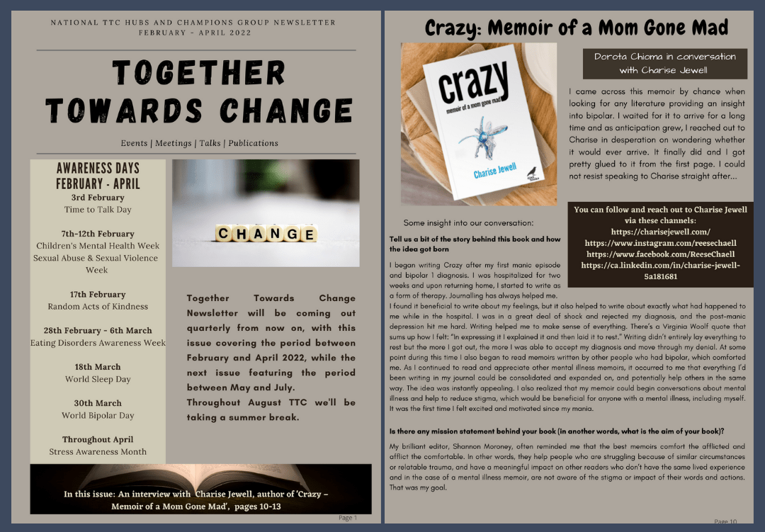Honoured to be featured in the Together Towards Change newsletter, representing the Time to Change Hubs and Champions Group working to end discrimination against people with mental health problems. Click on the images below to read each page, or download the pdf here. Click here to learn more about my memoir.